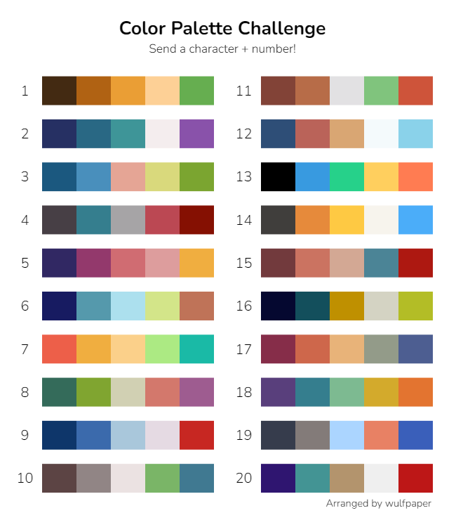I've created my own color palette challenge if you'd like to try this out yourself. Most palettes are directly color-picked from my own artwork. The image is set as gray in the web browser, but will appear in color when you download it. Remember to set your device to grayscale before you save and open it in your drawing program!