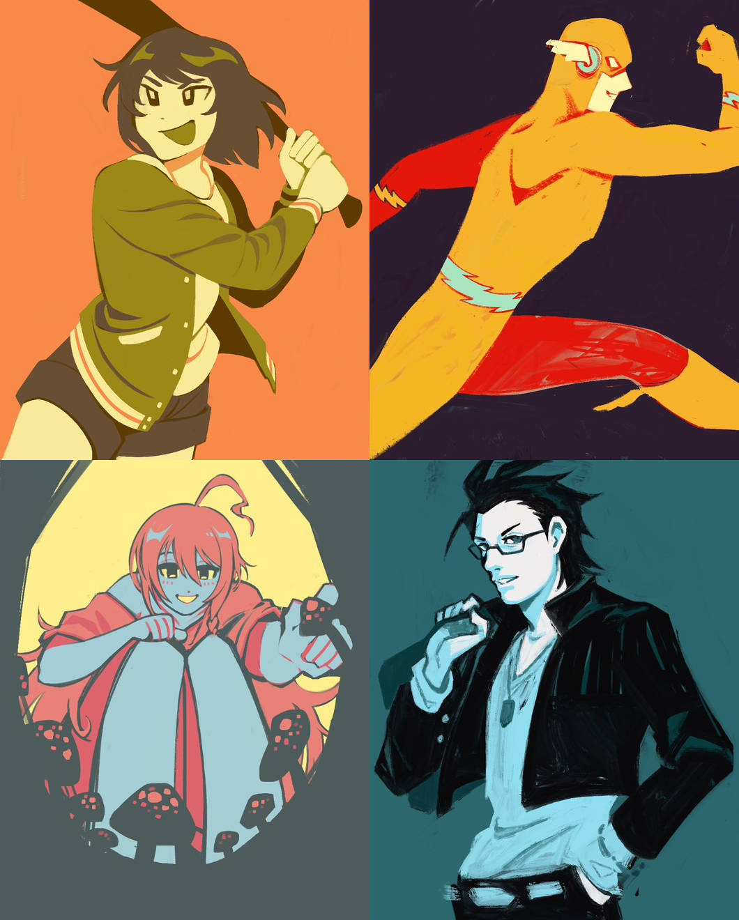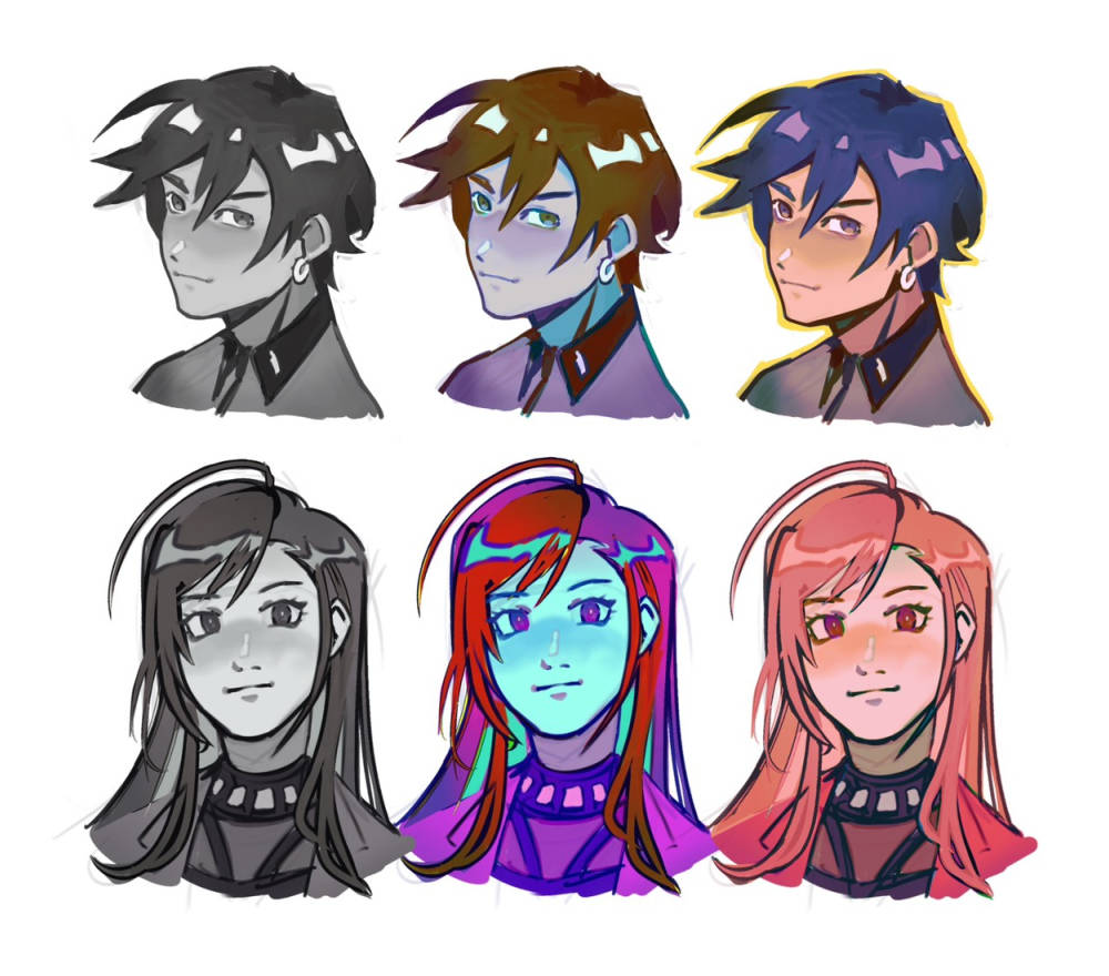 I haven't done a color palette challenge since my tumblr days, but they seemed like a good opportunity to practice value work. So I set my iPad to grayscale and picked a random challenge chart off Google, then asked friends to give me a character and number. These were the results: